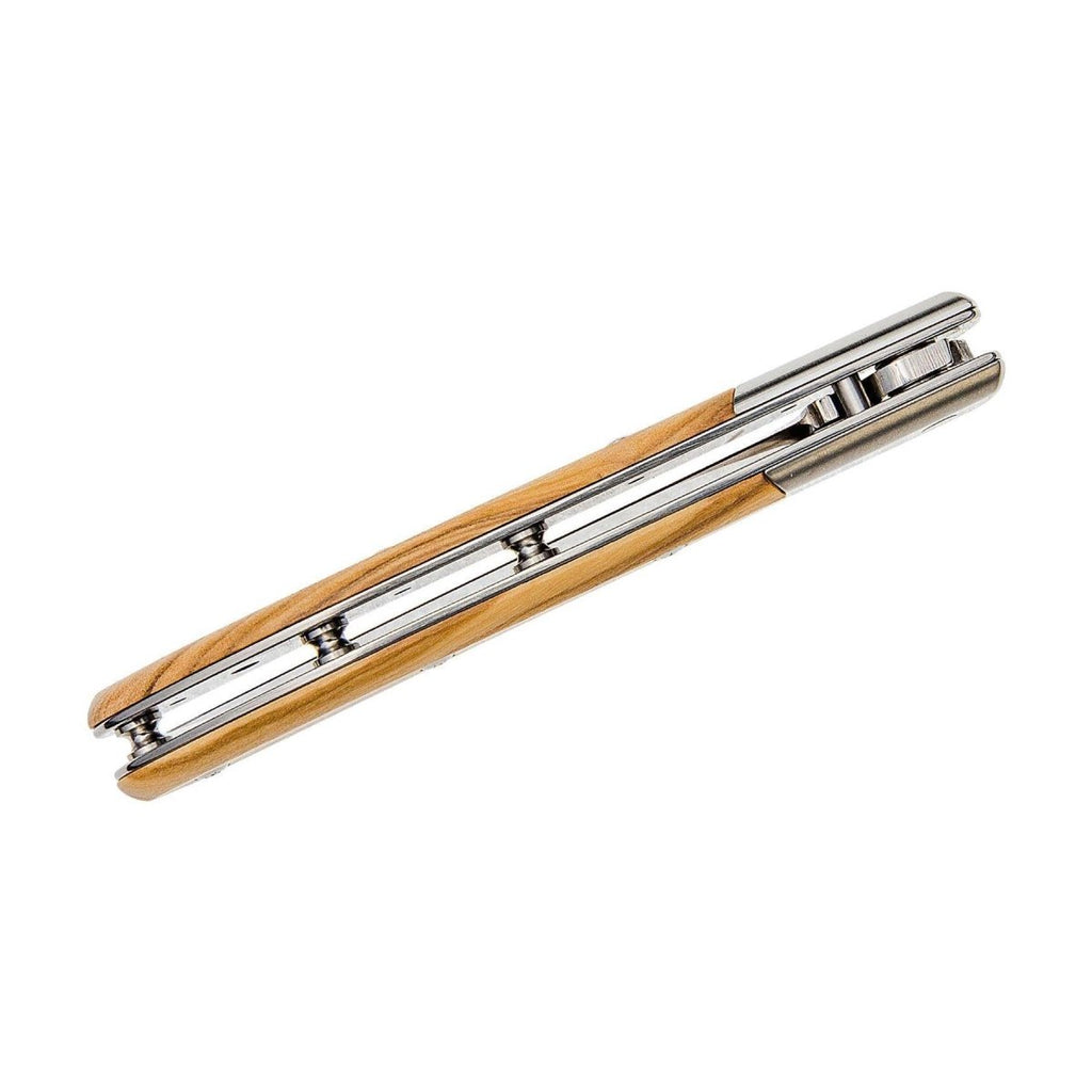 • The olive wood handle shows a unique natural grain. Stainless steel frames add strength and a polished, classic touch. The knife balances elegance with durability, making it suitable for both everyday use and special occasions.