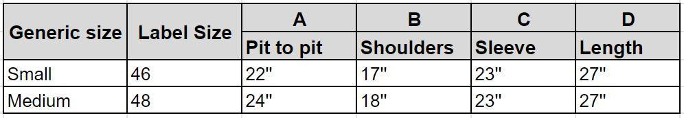 Pit to pit | Shoulders | Sleeve | Length | ||