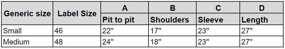 | Pit to pit | Shoulders | Sleeve | Length | ||