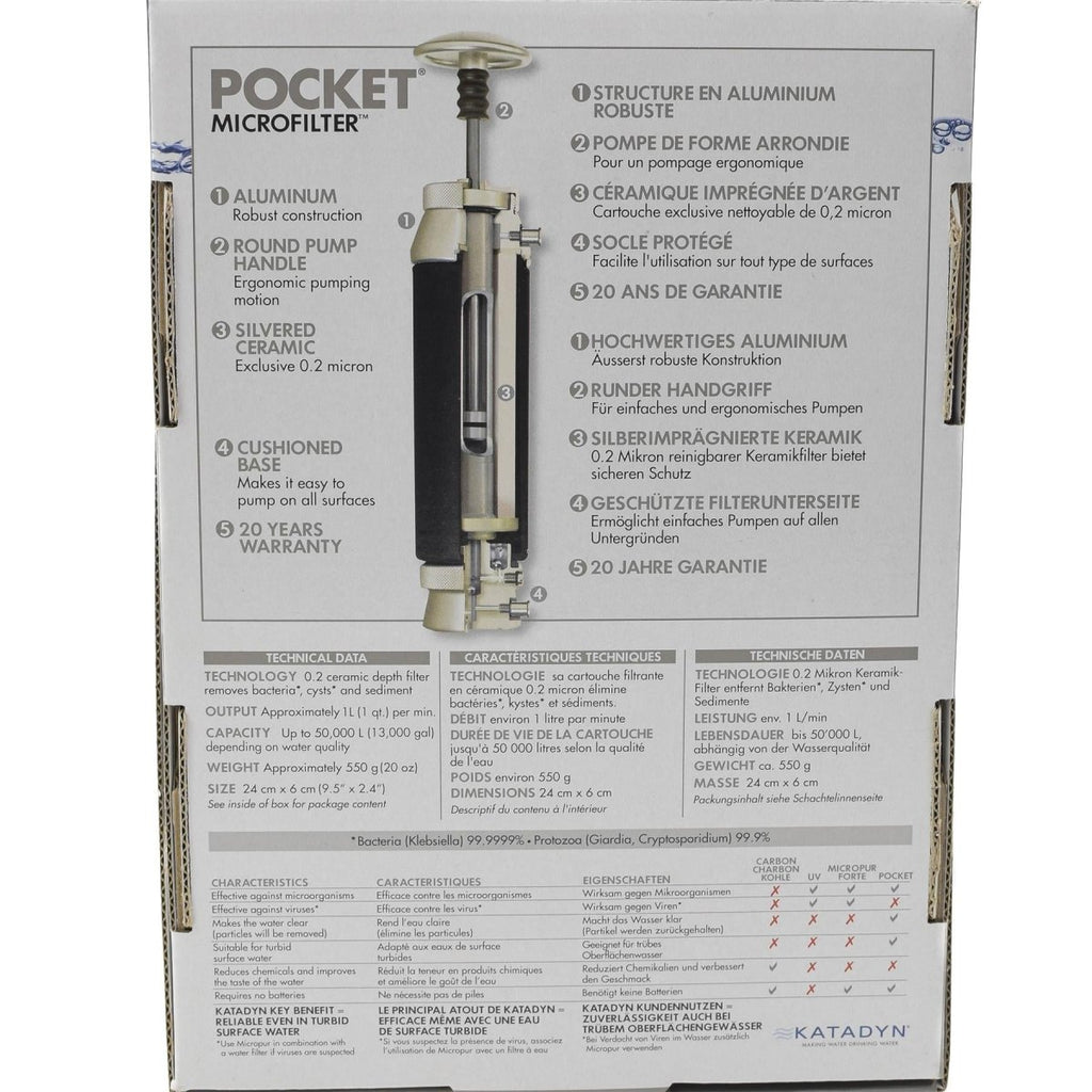- The Katadyn Pocket Microfilter is ideal for small groups, handling water filtration needs for 1-4 people on extended treks or expeditions. It’s designed to last, with a capacity of up to 50,000 liters, depending on water quality. The silver-impregnated ceramic filter removes harmful bacteria, protozoa, and other disease-causing agents. Ensuring you stay safe during your journey.