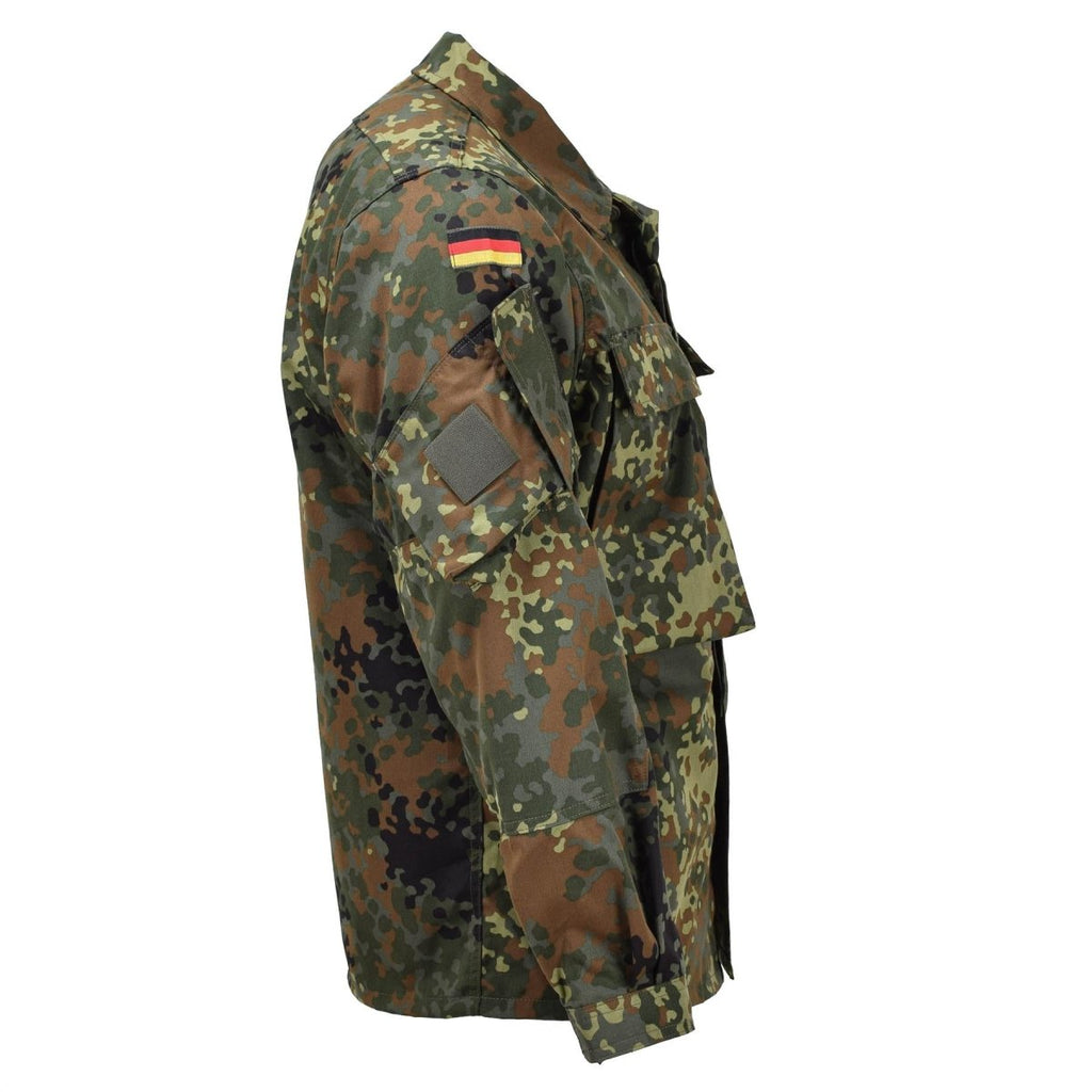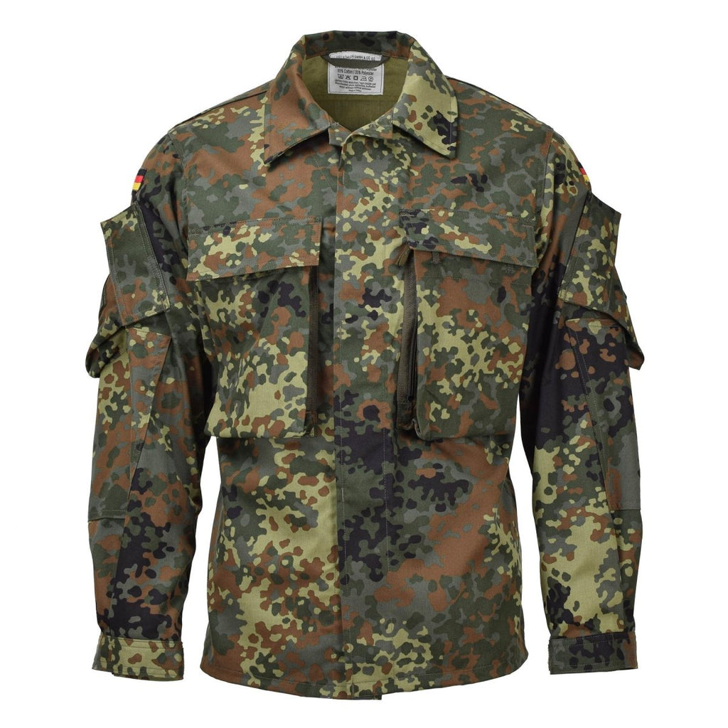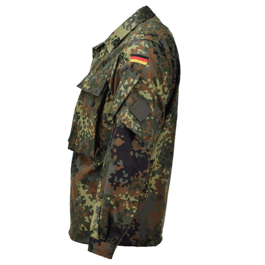• Furthermore, the breathable fabric of the flecktarn camo shirt ensures comfort during prolonged wear, while the adjustable cuffs allow for a tailored fit. Additionally, the shirt's reinforced elbows provide extra durability in high-impact areas. Moreover, the inclusion of a German flag on each arm adds a patriotic touch, reflecting its military heritage.