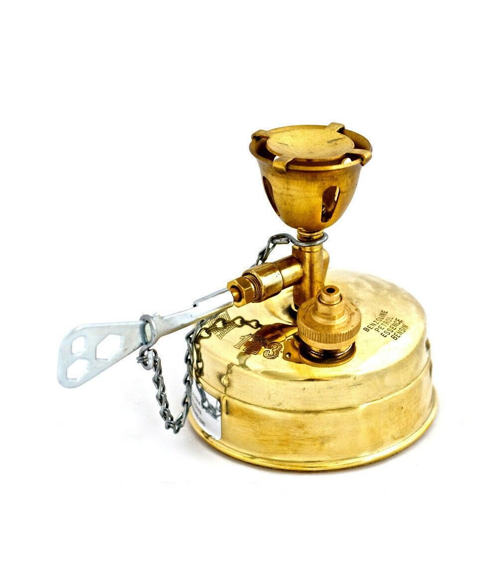• This compact and lightweight stove uses manually filled liquid fuel, making it perfect for camping, hiking, and backpacking. Its brass construction ensures durability, while its design focuses on portability and ease of use.