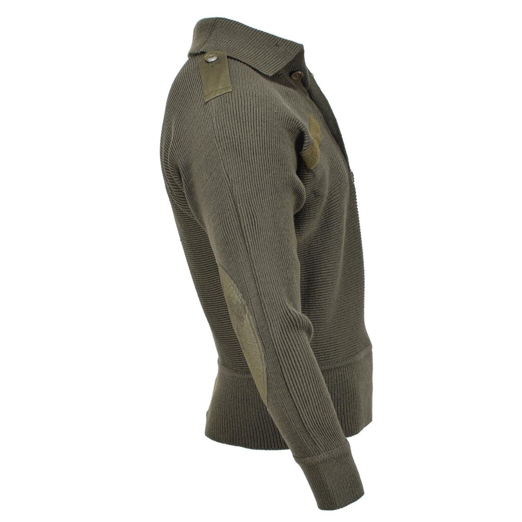 The Original Austrian Military Alpine Pullover is a rib knit sweater designed for alpine environments by the Austrian military. It features reinforced elbow patches to enhance durability and prevent wear and tear. The sweater is made of a wool blend, which provides warmth and breathability in cold conditions. It features a button closure instead of a half-zip front, making it more traditional in style. The reinforced elbows make it an ideal choice for outdoor enthusiasts and anyone seeking a sturdy and reliable sweater.