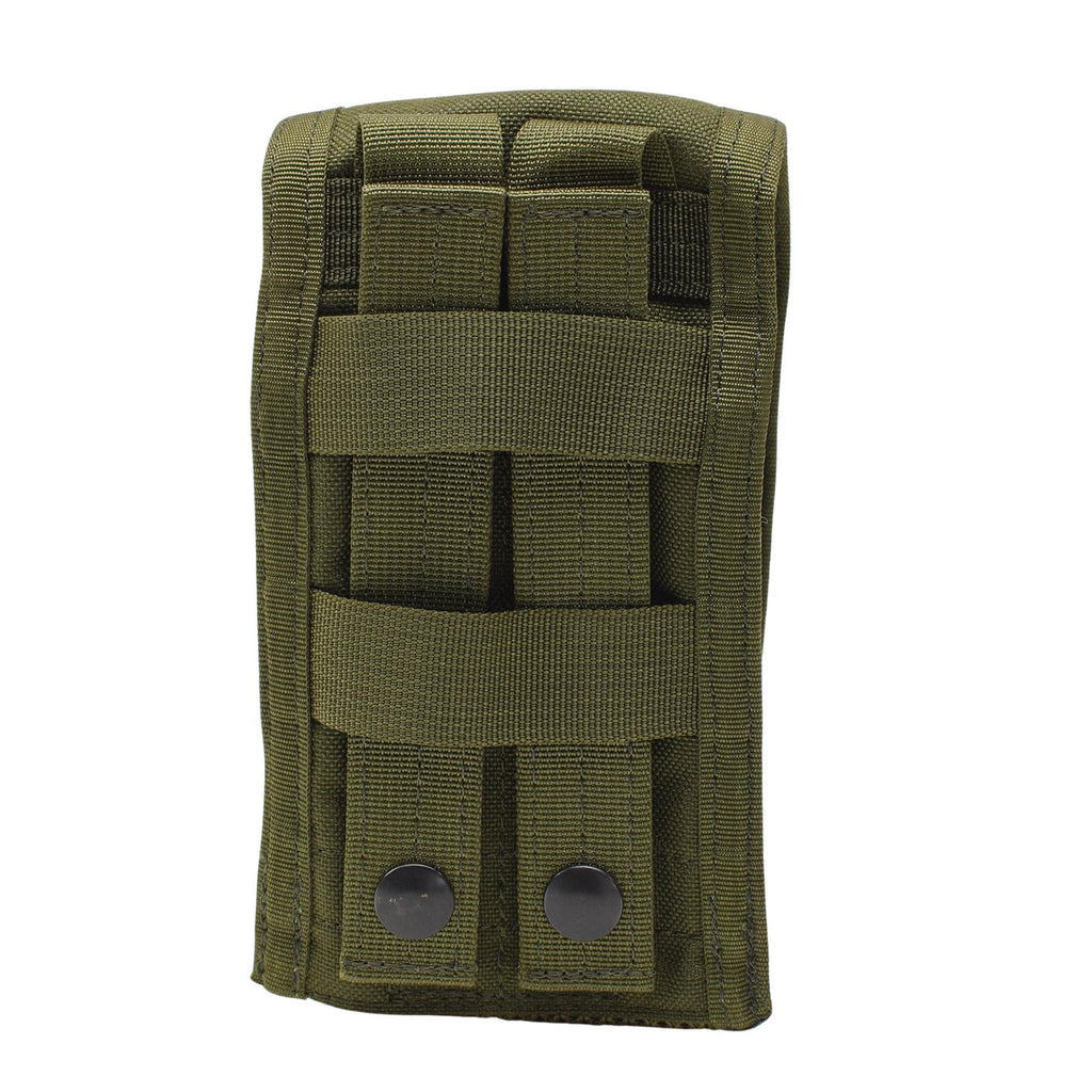 - Made from durable nylon, this pouch offers long-lasting performance in tough conditions. Its olive green color blends well with military and tactical gear, providing a practical and versatile storage solution. The pouch features a secure flap with a snap button closure to ensure the magazines stay safely in place.