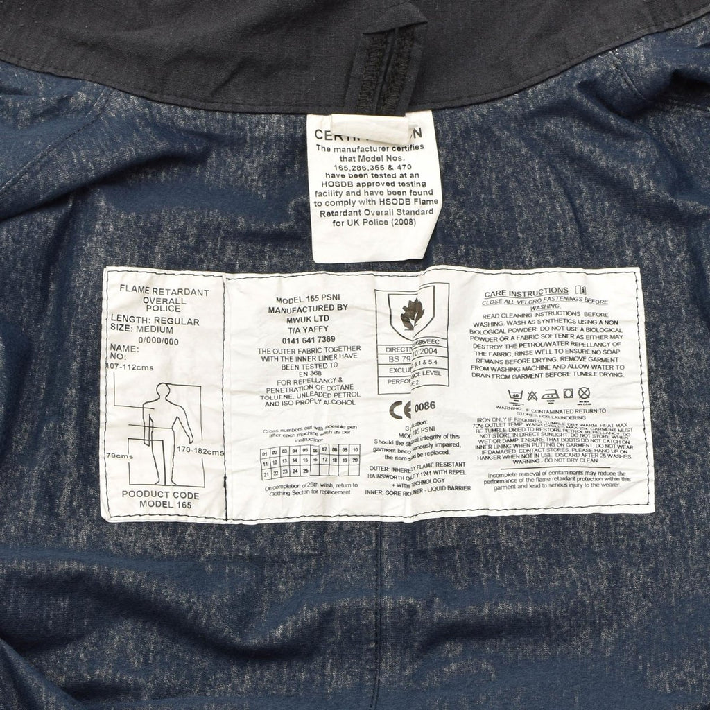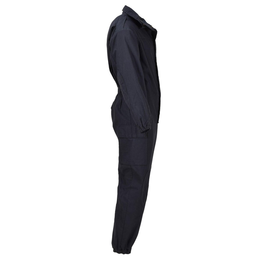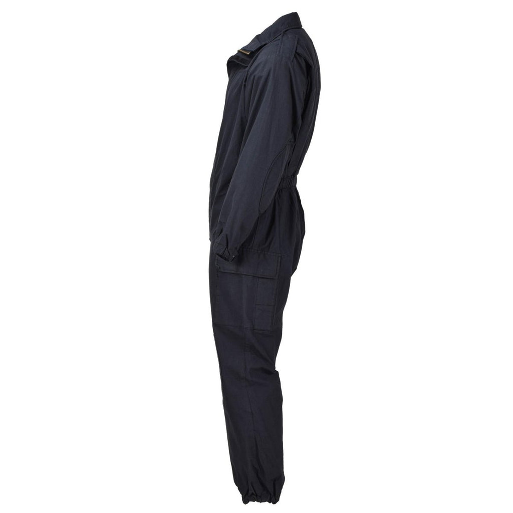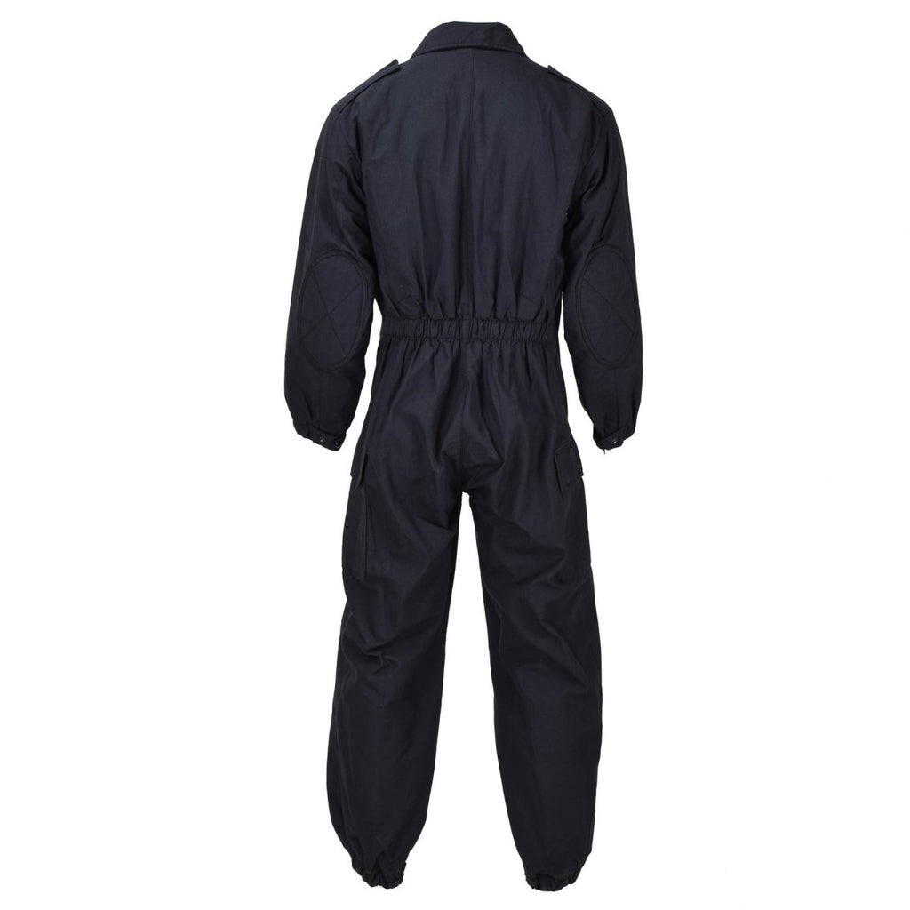 This coverall suit with a hood and zippers is an original British Military Police black coverall water flame-resistant jumpsuit. It is designed with adjustable ankles and cuffs, reinforced knees and elbows, and made from water-repellent, flame-resistant material for maximum protection and durability.