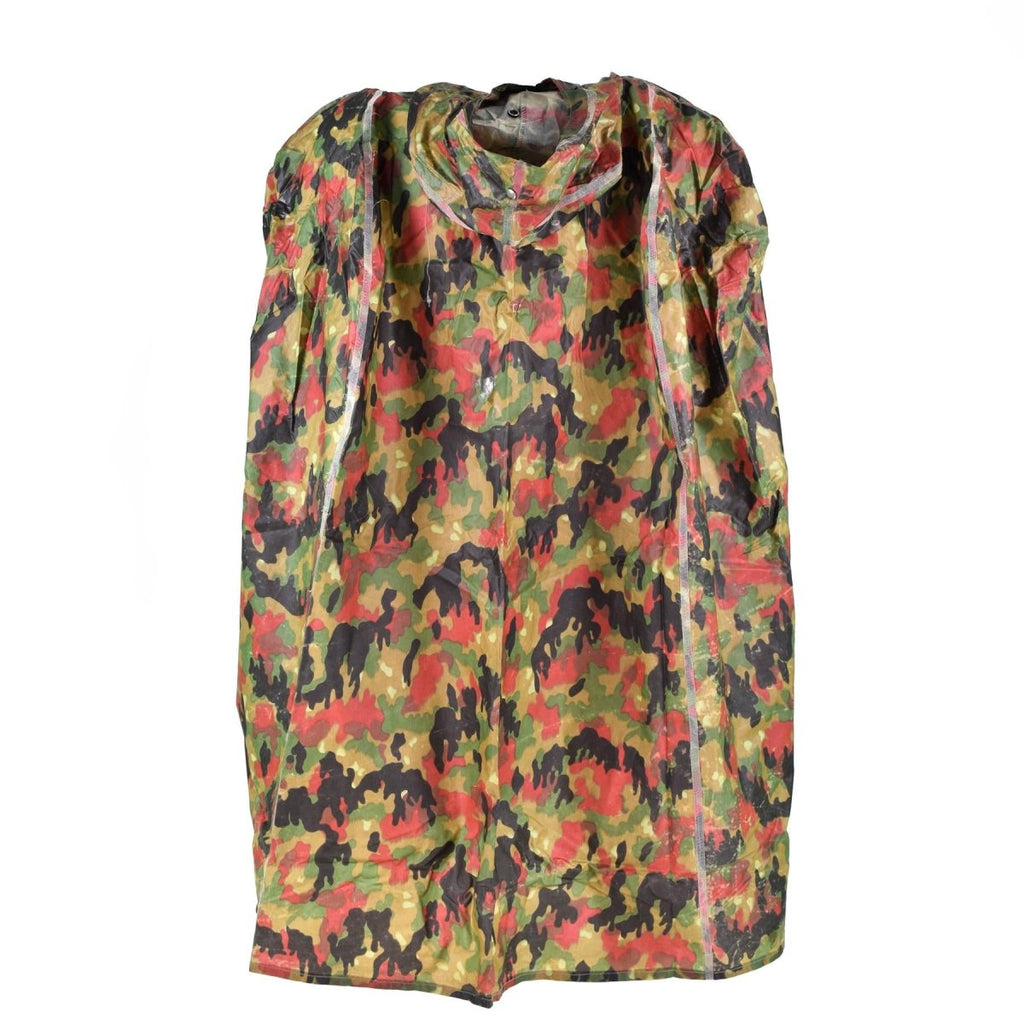 - Crafted from durable plastic material, the Swiss Alpenflage Poncho stands up to rain and keeps you dry. The lightweight and compact design makes it easy to carry in your backpack, so you can rely on it when you need it most. Whether hiking, camping, or trekking, this poncho shields you from the elements, providing full coverage to keep your gear and body dry.