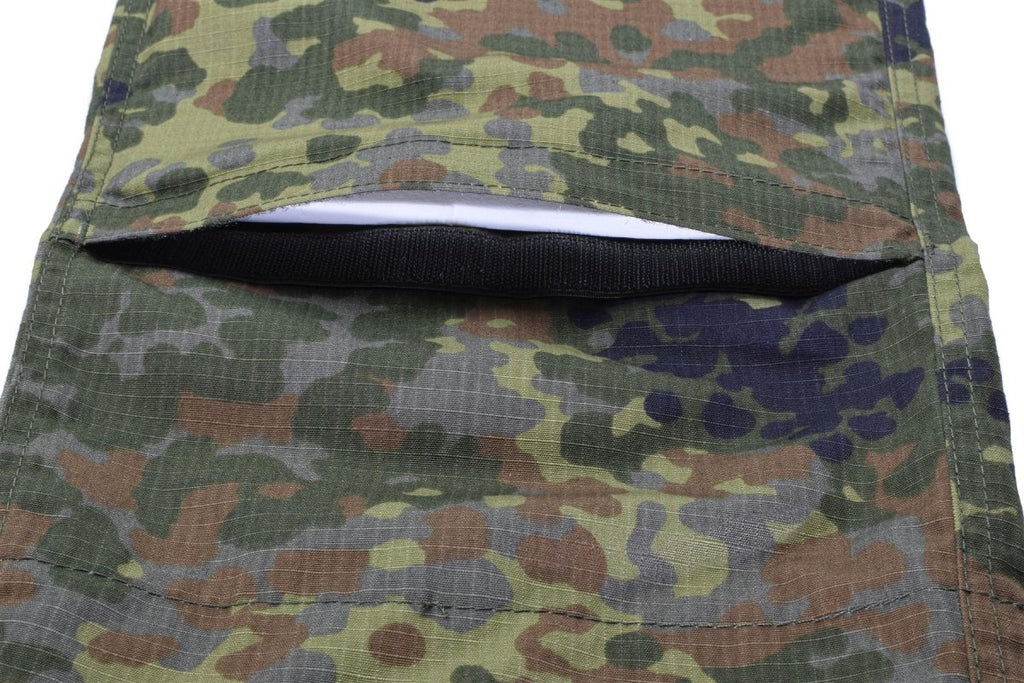 • Crafted from high-quality ripstop material, these flecktarn cargo pants resist tearing and stand up to heavy use. The reinforced seat and knees add extra durability, making them ideal for crawling, kneeling, or intense activity. The flecktarn camouflage pattern blends seamlessly with natural surroundings, providing effective concealment in wooded areas.